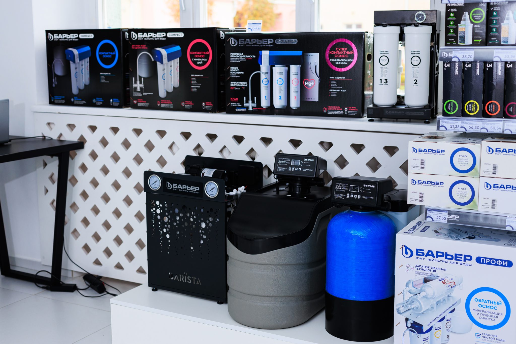 В магазине подключены 5 систем под мойками. Также представлена коттеджная система очистки с запатентованными засыпками и профессиональные системы для кофеен и ресторанов “Барьер”.