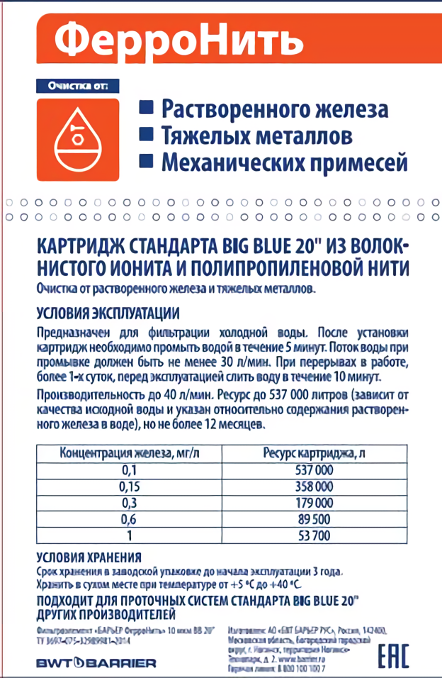 Большой рабочий ресурс: до 537 000 литров (зависит от концентрации железа в воде)