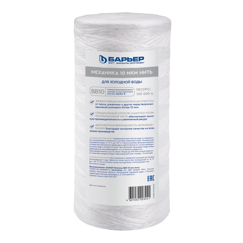 Фильтроэлемент БАРЬЕР «Механика 10 мкм нить» предназначен для очистки холодной воды от механических примесей размером до 10 мкм (песок, ржавчина и другие механические примеси).