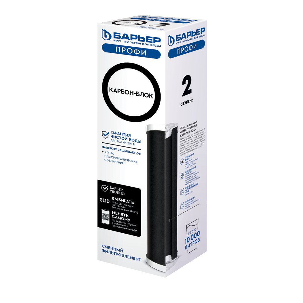 Картридж БАРЬЕР ПРОФИ Карбон-Блок используется в качестве второй ступени в фильтре БАРЬЕР ПРОФИ Стандарт, в качестве третьей ступени в системе БАРЬЕР ПРОФИ Жесткость х2 и в качестве четвертой ступени в фильтре ПРОФИ Осмо 600.. Очищает воду от соединений хлора и механических загрязнений.