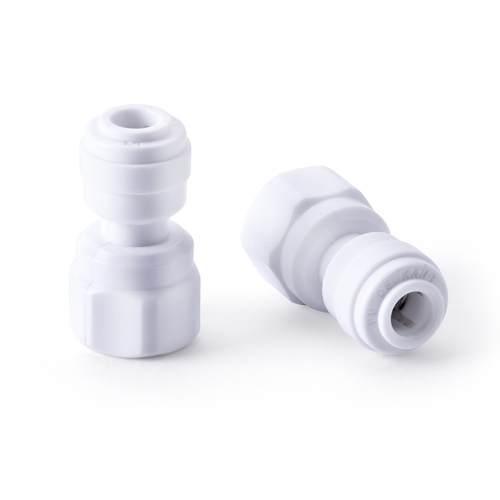 Фитинг с внутренней резьбой. Предназначен для соединения фильтра и крана для питьевой воды. Дает возможность соединить отрезки пластиковых коннекторов и трубок разных диаметров и зафиксировать их. Изготовлен из пищевого пластика.
